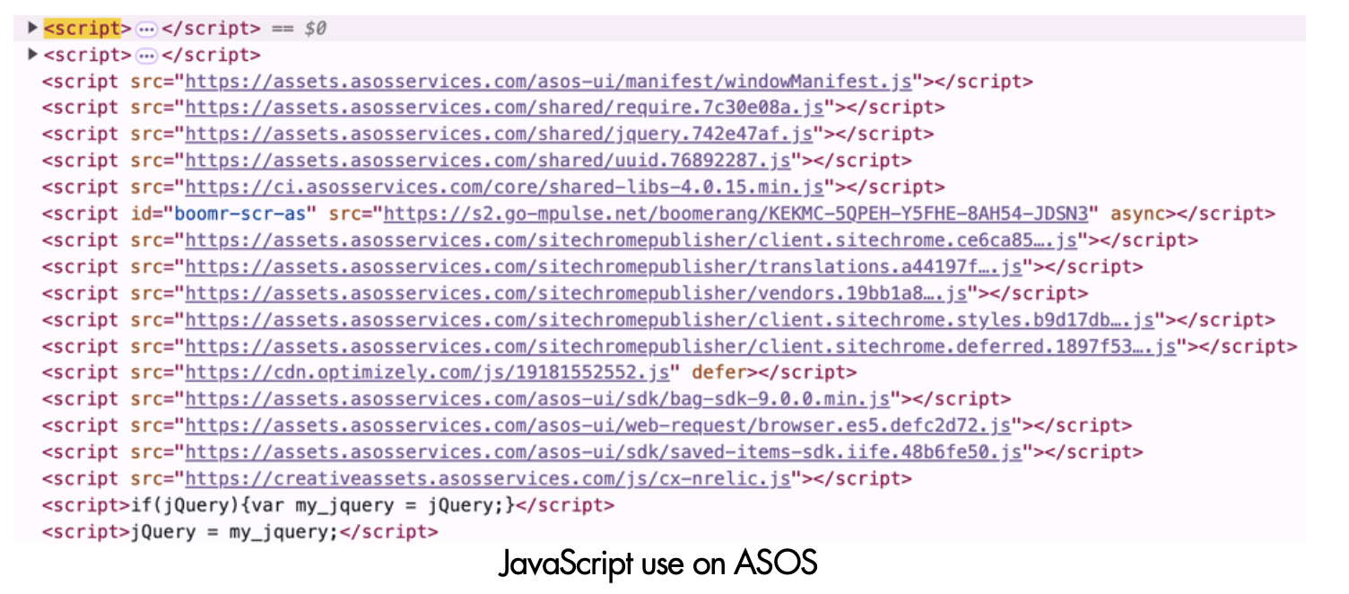 I used browser developer tools to inspect ASOS’s native code, identifying the core HTML structure, CSS stylesheets, and JavaScript functionality. The site relies heavily on JavaScript for interactivity, which can impact loading speed and mobile performance. Metadata was present but could be enhanced for richer SERP appearance. Key technical SEO factors such as mobile responsiveness and page load speed were analysed using both manual inspection and Lighthouse testing.